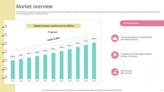 This slide showcases the market size and forecast of global cosmetics industry from 2023 to 2033. It also includes growth factors such as consumer preference towards herbal and natural products and increasing use of anti-aging products by older consumers.If you are looking for a format to display your unique thoughts, then the professionally designed Market Overview Skincare Startup GTM Strategy GTM SS V is the one for you. You can use it as a Google Slides template or a PowerPoint template. Incorporate impressive visuals, symbols, images, and other charts. Modify or reorganize the text boxes as you desire. Experiment with shade schemes and font pairings. Alter, share or cooperate with other people on your work. Download Market Overview Skincare Startup GTM Strategy GTM SS V and find out how to give a successful presentation. Present a perfect display to your team and make your presentation unforgettable. This slide showcases the market size and forecast of global cosmetics industry from 2023 to 2033. It also includes growth factors such as consumer preference towards herbal and natural products and increasing use of anti-aging products by older consumers.