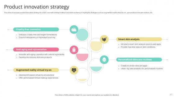 The slide showcases product innovation strategy for a B2C cosmetic startup to attract and retain audience. It highlights strategies such as augmented reality virtual try-on, personalized skincare routines, etc.This modern and well-arranged Product Innovation Strategy Skincare Startup GTM Strategy GTM SS V provides lots of creative possibilities. It is very simple to customize and edit with the Powerpoint Software. Just drag and drop your pictures into the shapes. All facets of this template can be edited with Powerpoint, no extra software is necessary. Add your own material, put your images in the places assigned for them, adjust the colors, and then you can show your slides to the world, with an animated slide included. The slide showcases product innovation strategy for a B2C cosmetic startup to attract and retain audience. It highlights strategies such as augmented reality virtual try-on, personalized skincare routines, etc.