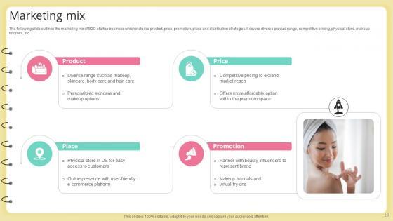 The following slide outlines the marketing mix of B2C startup business which includes product, price, promotion, place and distribution strategies. It covers diverse product range, competitive pricing, physical store, makeup tutorials, etc.Are you in need of a template that can accommodate all of your creative concepts This one is crafted professionally and can be altered to fit any style. Use it with Google Slides or PowerPoint. Include striking photographs, symbols, depictions, and other visuals. Fill, move around, or remove text boxes as desired. Test out color palettes and font mixtures. Edit and save your work, or work with colleagues. Download Marketing Mix Skincare Startup GTM Strategy GTM SS V and observe how to make your presentation outstanding. Give an impeccable presentation to your group and make your presentation unforgettable. The following slide outlines the marketing mix of B2C startup business which includes product, price, promotion, place and distribution strategies. It covers diverse product range, competitive pricing, physical store, makeup tutorials, etc.