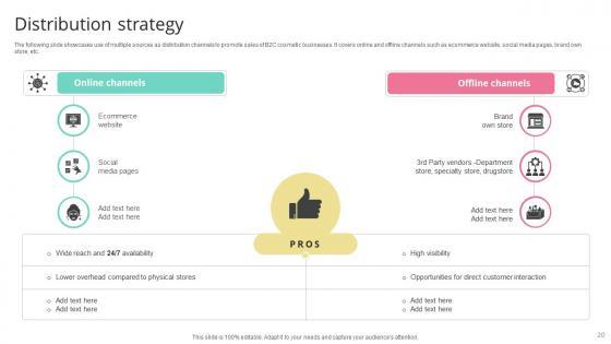 The following slide showcases use of multiple sources as distribution channels to promote sales of B2C cosmetic businesses. It covers online and offline channels such as ecommerce website, social media pages, brand own store, etc.Present like a pro with Distribution Strategy Skincare Startup GTM Strategy GTM SS V. Create beautiful presentations together with your team, using our easy-to-use presentation slides. Share your ideas in real-time and make changes on the fly by downloading our templates. So whether you are in the office, on the go, or in a remote location, you can stay in sync with your team and present your ideas with confidence. With Slidegeeks presentation got a whole lot easier. Grab these presentations today. The following slide showcases use of multiple sources as distribution channels to promote sales of B2C cosmetic businesses. It covers online and offline channels such as ecommerce website, social media pages, brand own store, etc.