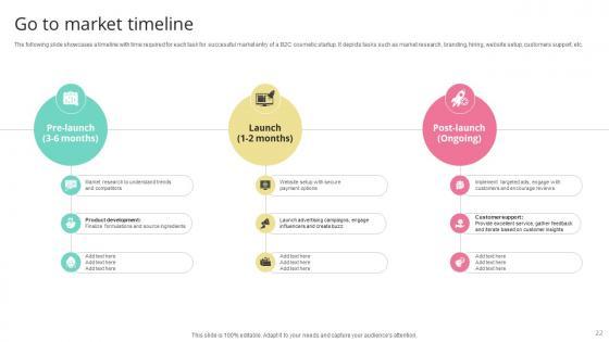 The following slide showcases a timeline with time required for each task for successful market entry of a B2C cosmetic startup. It depicts tasks such as market research, branding, hiring, website setup, customers support, etc.Do you have an important presentation coming up Are you looking for something that will make your presentation stand out from the rest Look no further than Go To Market Timeline Skincare Startup GTM Strategy GTM SS V. With our professional designs, you can trust that your presentation will pop and make delivering it a smooth process. And with Slidegeeks, you can trust that your presentation will be unique and memorable. So why wait Grab Go To Market Timeline Skincare Startup GTM Strategy GTM SS V today and make your presentation stand out from the rest The following slide showcases a timeline with time required for each task for successful market entry of a B2C cosmetic startup. It depicts tasks such as market research, branding, hiring, website setup, customers support, etc.
