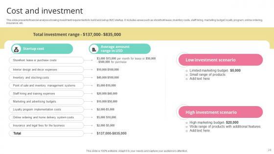This slide presents financial analysis showing investment requirements to build and set up B2C startup. It includes areas such as storefront lease, inventory costs, staff hiring, marketing budget, loyalty program, online ordering, insurance, etc.Do you have to make sure that everyone on your team knows about any specific topic I yes, then you should give Cost And Investment Skincare Startup GTM Strategy GTM SS V a try. Our experts have put a lot of knowledge and effort into creating this impeccable Cost And Investment Skincare Startup GTM Strategy GTM SS V. You can use this template for your upcoming presentations, as the slides are perfect to represent even the tiniest detail. You can download these templates from the Slidegeeks website and these are easy to edit. So grab these today This slide presents financial analysis showing investment requirements to build and set up B2C startup. It includes areas such as storefront lease, inventory costs, staff hiring, marketing budget, loyalty program, online ordering, insurance, etc.