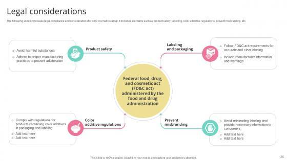 The following slide showcases legal compliance and considerations for B2C cosmetic startup. It includes elements such as product safety, labelling, color addictive regulations, prevent misbranding, etc.If your project calls for a presentation, then Slidegeeks is your go-to partner because we have professionally designed, easy-to-edit templates that are perfect for any presentation. After downloading, you can easily edit Legal Considerations Skincare Startup GTM Strategy GTM SS V and make the changes accordingly. You can rearrange slides or fill them with different images. Check out all the handy templates The following slide showcases legal compliance and considerations for B2C cosmetic startup. It includes elements such as product safety, labelling, color addictive regulations, prevent misbranding, etc.