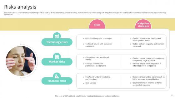 The slide outlines potential risks and challenges in B2C start-up. It includes risks such as technology, market and financial risks along with mitigation strategies like update software, conduct market research, explore funding options, etc.This Risks Analysis Skincare Startup GTM Strategy GTM SS V is perfect for any presentation, be it in front of clients or colleagues. It is a versatile and stylish solution for organizing your meetings. The Risks Analysis Skincare Startup GTM Strategy GTM SS V features a modern design for your presentation meetings. The adjustable and customizable slides provide unlimited possibilities for acing up your presentation. Slidegeeks has done all the homework before launching the product for you. So, do not wait, grab the presentation templates today The slide outlines potential risks and challenges in B2C start-up. It includes risks such as technology, market and financial risks along with mitigation strategies like update software, conduct market research, explore funding options, etc.