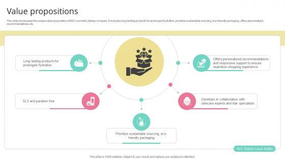 This slide showcases the unique value proposition of B2C cosmetic startup company. It includes long lasting products for prolonged hydration, prioritize sustainable sourcing, eco-friendly packaging, offers personalized recommendations, etc.The best PPT templates are a great way to save time, energy, and resources. Slidegeeks have 100 percent editable powerpoint slides making them incredibly versatile. With these quality presentation templates, you can create a captivating and memorable presentation by combining visually appealing slides and effectively communicating your message. Download Value Propositions Skincare Startup GTM Strategy GTM SS V from Slidegeeks and deliver a wonderful presentation. This slide showcases the unique value proposition of B2C cosmetic startup company. It includes long lasting products for prolonged hydration, prioritize sustainable sourcing, eco-friendly packaging, offers personalized recommendations, etc.