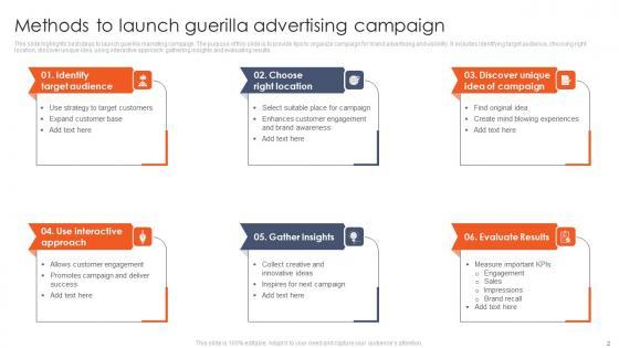 This slide highlights best ideas to launch guerilla marketing campaign. The purpose of this slide is to provide tips to organize campaign for brand advertising and visibility. It includes identifying target audience, choosing right location, discover unique idea, using interactive approach, gathering insights and evaluating results. Showcasing this set of slides titled Methods To Launch Guerilla Advertising Campaign Graphics Pdf. The topics addressed in these templates are Identify Target Audience, Interactive Approach, Gather Insights. All the content presented in this PPT design is completely editable. Download it and make adjustments in color, background, font etc. as per your unique business setting. This slide highlights best ideas to launch guerilla marketing campaign. The purpose of this slide is to provide tips to organize campaign for brand advertising and visibility. It includes identifying target audience, choosing right location, discover unique idea, using interactive approach, gathering insights and evaluating results.