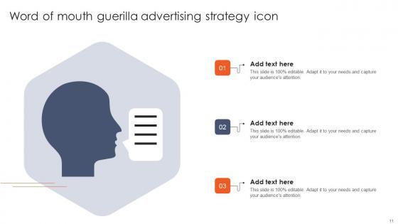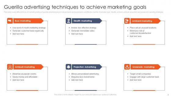 If designing a presentation takes a lot of your time and resources and you are looking for a better alternative, then this Guerilla Advertising Ppt Powerpoint Presentation Complete Deck With Slides is the right fit for you. This is a prefabricated set that can help you deliver a great presentation on the topic. All the twelve slides included in this sample template can be used to present a birds-eye view of the topic. These slides are also fully editable, giving you enough freedom to add specific details to make this layout more suited to your business setting. Apart from the content, all other elements like color, design, theme are also replaceable and editable. This helps in designing a variety of presentations with a single layout. Not only this, you can use this PPT design in formats like PDF, PNG, and JPG once downloaded. Therefore, without any further ado, download and utilize this sample presentation as per your liking. Our Guerilla Advertising Ppt Powerpoint Presentation Complete Deck With Slides are topically designed to provide an attractive backdrop to any subject. Use them to look like a presentation pro.