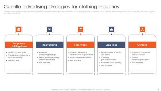 This slide covers techniques of guerilla marketing involved in clothing industry for promoting brand value and increasing customer engagement. These strategies are temporary clothing stores, bagvertising, flier swaps, long lines and organizing contests. Pitch your topic with ease and precision using this Guerilla Advertising Strategies For Clothing Industries Formats Pdf. This layout presents information on Temporary Clothing Stores, Flier Swaps, Long Lines. It is also available for immediate download and adjustment. So, changes can be made in the color, design, graphics or any other component to create a unique layout. This slide covers techniques of guerilla marketing involved in clothing industry for promoting brand value and increasing customer engagement. These strategies are temporary clothing stores, bagvertising, flier swaps, long lines and organizing contests.