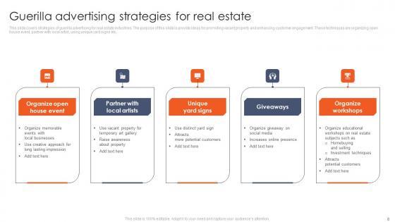 This slide covers strategies of guerilla advertising for real estate industries. The purpose of this slide is provide ideas for promoting vacant property and enhancing customer engagement. These techniques are organizing open house event, partner with local artist, using unique yard signs etc. Showcasing this set of slides titled Guerilla Advertising Strategies For Real Estate Slides Pdf. The topics addressed in these templates are Organize Open, Partner With Local Artists, Unique Yard Signs. All the content presented in this PPT design is completely editable. Download it and make adjustments in color, background, font etc. as per your unique business setting. This slide covers strategies of guerilla advertising for real estate industries. The purpose of this slide is provide ideas for promoting vacant property and enhancing customer engagement. These techniques are organizing open house event, partner with local artist, using unique yard signs etc.