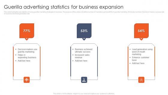 This slide highlights real statistics of using guerilla marketing strategies in business. The purpose of this slide is to define number of marketers got benefit from guerilla marketing. It includes number of decision makers, success rate of business and lead generation rate. Showcasing this set of slides titled Guerilla Advertising Statistics For Business Expansion Background Pdf. The topics addressed in these templates are Decision Makers, Business Achieved, Enhance Customer. All the content presented in this PPT design is completely editable. Download it and make adjustments in color, background, font etc. as per your unique business setting. This slide highlights real statistics of using guerilla marketing strategies in business. The purpose of this slide is to define number of marketers got benefit from guerilla marketing. It includes number of decision makers, success rate of business and lead generation rate.