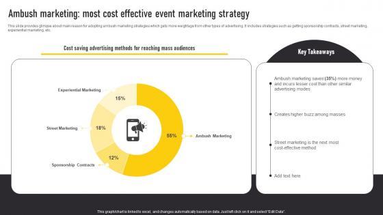 This slide provides glimpse about main reason for adopting ambush marketing strategies which gets more weightage from other types of advertising. It includes strategies such as getting sponsorship contracts, street marketing, experiential marketing, etc. Slidegeeks is here to make your presentations a breeze with Ambush Marketing Most Cost Effective Event Marketing Automate Guerrilla Promotional Download Pdf With our easy-to-use and customizable templates, you can focus on delivering your ideas rather than worrying about formatting. With a variety of designs to choose from, you are sure to find one that suits your needs. And with animations and unique photos, illustrations, and fonts, you can make your presentation pop. So whether you are giving a sales pitch or presenting to the board, make sure to check out Slidegeeks first. This slide provides glimpse about main reason for adopting ambush marketing strategies which gets more weightage from other types of advertising. It includes strategies such as getting sponsorship contracts, street marketing, experiential marketing, etc.
