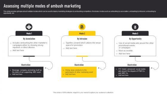 If your project calls for a presentation, then Slidegeeks is your go-to partner because we have professionally designed, easy-to-edit templates that are perfect for any presentation. After downloading, you can easily edit Assessing Multiple Modes Of Ambush Marketing Automate Guerrilla Promotional Formats Pdf and make the changes accordingly. You can rearrange slides or fill them with different images. Check out all the handy templates This slide provides glimpse about multiple modes which can be used to deploy marketing strategies by ambushing competitors. It includes modes such as ambushing by association, ambushing by intrusion, ambushing by opportunity, etc.