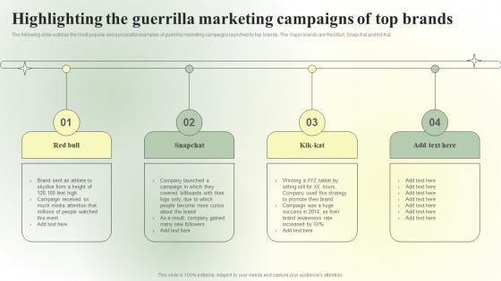 The following slide outlines the most popular and successful examples of guerrilla marketing campaigns launched by top brands. The major brands are Red Bull, Snapchat and Kit Kat. Crafting an eye catching presentation has never been more straightforward. Let your presentation shine with this tasteful yet straightforward Highlighting The Guerrilla Marketing Campaigns Of Top Brands Template PDF template. It offers a minimalistic and classy look that is great for making a statement. The colors have been employed intelligently to add a bit of playfulness while still remaining professional. Construct the ideal Highlighting The Guerrilla Marketing Campaigns Of Top Brands Template PDF that effortlessly grabs the attention of your audience Begin now and be certain to wow your customers.