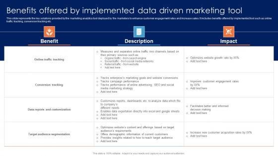 This slide represents the key solutions provided by the marketing analytics tool deployed by the marketers to enhance customer engagement rates and increase sales. It includes benefits offered by implemented tool such as online traffic tracking, conversion tracking etc.Crafting an eye-catching presentation has never been more straightforward. Let your presentation shine with this tasteful yet straightforward Benefits Offered By Implemented Data Guide For Data Driven Advertising Infographics Pdf template. It offers a minimalistic and classy look that is great for making a statement. The colors have been employed intelligently to add a bit of playfulness while still remaining professional. Construct the ideal Benefits Offered By Implemented Data Guide For Data Driven Advertising Infographics Pdf that effortlessly grabs the attention of your audience. Begin now and be certain to wow your customers. This slide represents the key solutions provided by the marketing analytics tool deployed by the marketers to enhance customer engagement rates and increase sales. It includes benefits offered by implemented tool such as online traffic tracking, conversion tracking etc.
