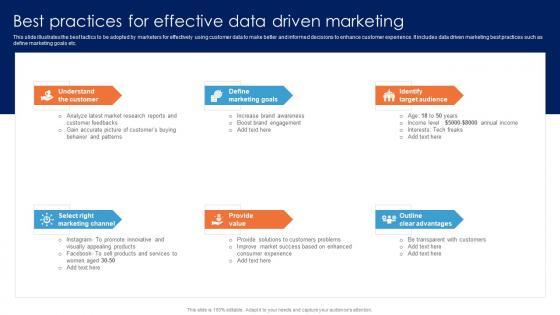 This slide illustrates the best tactics to be adopted by marketers for effectively using customer data to make better and informed decisions to enhance customer experience. It includes data driven marketing best practices such as define marketing goals etc.Make sure to capture your audiences attention in your business displays with our gratis customizable Best Practices For Effective Data Driven Guide For Data Driven Advertising Structure Pdf. These are great for business strategies, office conferences, capital raising or task suggestions. If you desire to acquire more customers for your tech business and ensure they stay satisfied, create your own sales presentation with these plain slides. This slide illustrates the best tactics to be adopted by marketers for effectively using customer data to make better and informed decisions to enhance customer experience. It includes data driven marketing best practices such as define marketing goals etc.