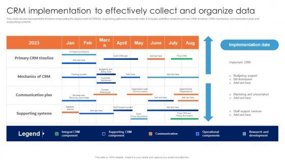 This slide shows represents the timeline showcasing the deployment of CRM for organizing gathered consumer data. It includes activities related to primary CRM timeline, CRM mechanics, communication plan and supporting systems.This CRM Implementation To Effectively Collect Guide For Data Driven Advertising Topics Pdf is perfect for any presentation, be it in front of clients or colleagues. It is a versatile and stylish solution for organizing your meetings. The CRM Implementation To Effectively Collect Guide For Data Driven Advertising Topics Pdf features a modern design for your presentation meetings. The adjustable and customizable slides provide unlimited possibilities for acing up your presentation. Slidegeeks has done all the homework before launching the product for you. So, do not wait, grab the presentation templates today This slide shows represents the timeline showcasing the deployment of CRM for organizing gathered consumer data. It includes activities related to primary CRM timeline, CRM mechanics, communication plan and supporting systems.