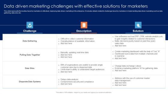 This slide represents the hurdles faced by marketers in effectively deploying data driven marketing in the enterprise. It includes details related to challenges faced by marketers in implementing data driven marketing such as data gathering, data silos etc.Are you searching for a Data Driven Marketing Challenges With Effective Guide For Data Driven Advertising Graphics Pdf that is uncluttered, straightforward, and original Its easy to edit, and you can change the colors to suit your personal or business branding. For a presentation that expresses how much effort you have put in, this template is ideal. With all of its features, including tables, diagrams, statistics, and lists, its perfect for a business plan presentation. Make your ideas more appealing with these professional slides. Download Data Driven Marketing Challenges With Effective Guide For Data Driven Advertising Graphics Pdf from Slidegeeks today. This slide represents the hurdles faced by marketers in effectively deploying data driven marketing in the enterprise. It includes details related to challenges faced by marketers in implementing data driven marketing such as data gathering, data silos etc.