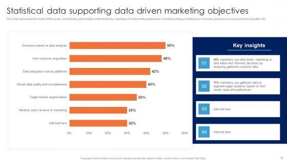 This slide represents the results of the survey conducted to gain insights related to the key objectives of implementing data driven marketing strategy in enterprise. It includes goals such as new customer acquisition etc.The Statistical Data Supporting Data Driven Marketing Objectives Guide For Data Driven Advertising Elements Pdf is a compilation of the most recent design trends as a series of slides. It is suitable for any subject or industry presentation, containing attractive visuals and photo spots for businesses to clearly express their messages. This template contains a variety of slides for the user to input data, such as structures to contrast two elements, bullet points, and slides for written information. Slidegeeks is prepared to create an impression. This slide represents the results of the survey conducted to gain insights related to the key objectives of implementing data driven marketing strategy in enterprise. It includes goals such as new customer acquisition etc.