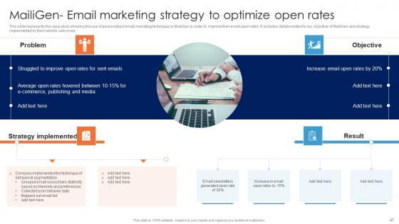 This slide represents the case study showing the use of personalized email marketing technique by MailiGen in order to improve their email open rates. It includes details related to key objective of MailiGen and strategy implemented by them and its outcomes.Whether you have daily or monthly meetings, a brilliant presentation is necessary. Mailigen Email Marketing Strategy To Optimize Open Guide For Data Driven Advertising Themes Pdf can be your best option for delivering a presentation. Represent everything in detail using Mailigen Email Marketing Strategy To Optimize Open Guide For Data Driven Advertising Themes Pdf and make yourself stand out in meetings. The template is versatile and follows a structure that will cater to your requirements. All the templates prepared by Slidegeeks are easy to download and edit. Our research experts have taken care of the corporate themes as well. So, give it a try and see the results. This slide represents the case study showing the use of personalized email marketing technique by MailiGen in order to improve their email open rates. It includes details related to key objective of MailiGen and strategy implemented by them and its outcomes.