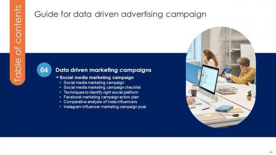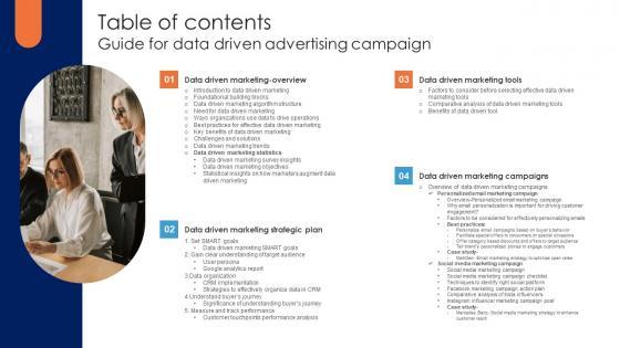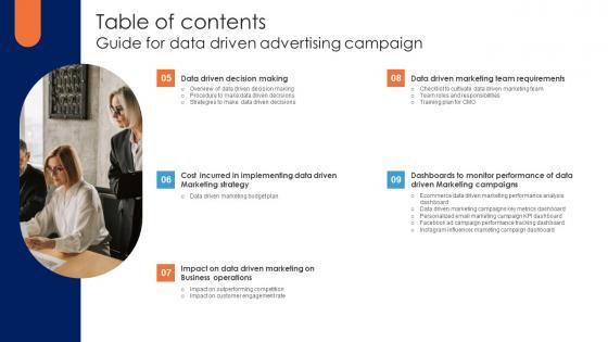 Want to ace your presentation in front of a live audience Our Guide For Data Driven Advertising Campaign Table Of Contents Sample Pdf can help you do that by engaging all the users towards you.. Slidegeeks experts have put their efforts and expertise into creating these impeccable powerpoint presentations so that you can communicate your ideas clearly. Moreover, all the templates are customizable, and easy-to-edit and downloadable. Use these for both personal and commercial use. Our Guide For Data Driven Advertising Campaign Table Of Contents Sample Pdf are topically designed to provide an attractive backdrop to any subject. Use them to look like a presentation pro.
