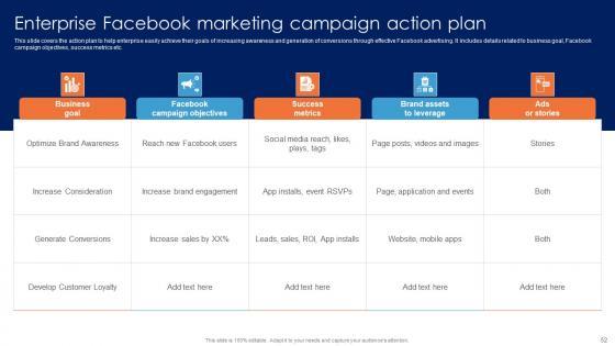 This slide covers the action plan to help enterprise easily achieve their goals of increasing awareness and generation of conversions through effective Facebook advertising. It includes details related to business goal, Facebook campaign objectives, success metrics etc.This Enterprise Facebook Marketing Campaign Guide For Data Driven Advertising Introduction Pdf from Slidegeeks makes it easy to present information on your topic with precision. It provides customization options, so you can make changes to the colors, design, graphics, or any other component to create a unique layout. It is also available for immediate download, so you can begin using it right away. Slidegeeks has done good research to ensure that you have everything you need to make your presentation stand out. Make a name out there for a brilliant performance. This slide covers the action plan to help enterprise easily achieve their goals of increasing awareness and generation of conversions through effective Facebook advertising. It includes details related to business goal, Facebook campaign objectives, success metrics etc.