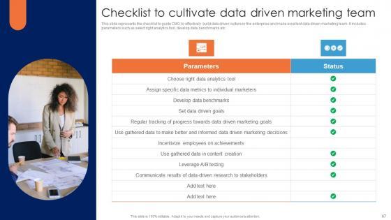 This slide represents the checklist to guide CMO to effectively build data driven culture in the enterprise and make excellent data driven marketing team. It includes parameters such as select right analytics tool, develop data benchmarks etc.Formulating a presentation can take up a lot of effort and time, so the content and message should always be the primary focus. The visuals of the PowerPoint can enhance the presenters message, so our Checklist To Cultivate Data Driven Marketing Guide For Data Driven Advertising Diagrams Pdf was created to help save time. Instead of worrying about the design, the presenter can concentrate on the message while our designers work on creating the ideal templates for whatever situation is needed. Slidegeeks has experts for everything from amazing designs to valuable content, we have put everything into Checklist To Cultivate Data Driven Marketing Guide For Data Driven Advertising Diagrams Pdf This slide represents the checklist to guide CMO to effectively build data driven culture in the enterprise and make excellent data driven marketing team. It includes parameters such as select right analytics tool, develop data benchmarks etc.