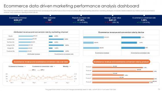 This slide represents the key metrics dashboard to track and analyze the performance of ecommerce business after implementing data driven marketing strategies. It includes details related to key metrics such as ecommerce revenue, new customers, repeat purchase rate etc.Here you can discover an assortment of the finest PowerPoint and Google Slides templates. With these templates, you can create presentations for a variety of purposes while simultaneously providing your audience with an eye-catching visual experience. Download Ecommerce Data Driven Marketing Performance Guide For Data Driven Advertising Brochure Pdf to deliver an impeccable presentation. These templates will make your job of preparing presentations much quicker, yet still, maintain a high level of quality. Slidegeeks has experienced researchers who prepare these templates and write high-quality content for you. Later on, you can personalize the content by editing the Ecommerce Data Driven Marketing Performance Guide For Data Driven Advertising Brochure Pdf. This slide represents the key metrics dashboard to track and analyze the performance of ecommerce business after implementing data driven marketing strategies. It includes details related to key metrics such as ecommerce revenue, new customers, repeat purchase rate etc.