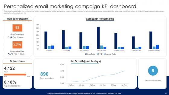 This slide represents the key performance metrics to dashboard to monitor and analyze progress of personalized email marketing campaign conducted by the enterprise. It includes details related to KPIs such as wen conversions, subscribers, list growth rate etc.Coming up with a presentation necessitates that the majority of the effort goes into the content and the message you intend to convey. The visuals of a PowerPoint presentation can only be effective if it supplements and supports the story that is being told. Keeping this in mind our experts created Personalized Email Marketing Campaign Kpi Dashboard Guide For Data Driven Advertising Icons Pdf to reduce the time that goes into designing the presentation. This way, you can concentrate on the message while our designers take care of providing you with the right template for the situation. This slide represents the key performance metrics to dashboard to monitor and analyze progress of personalized email marketing campaign conducted by the enterprise. It includes details related to KPIs such as wen conversions, subscribers, list growth rate etc.