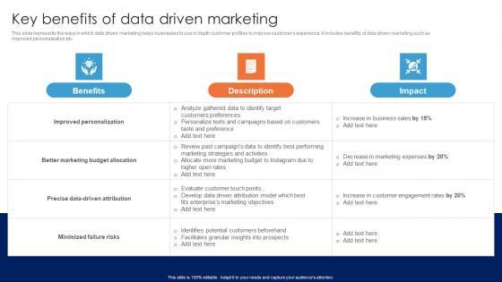This slide represents the ways in which data driven marketing helps businesses to use in depth customer profiles to improve customers experience. It includes benefits of data driven marketing such as improved personalization etc.Do you have an important presentation coming up Are you looking for something that will make your presentation stand out from the rest Look no further than Key Benefits Of Data Driven Marketing Guide For Data Driven Advertising Icons Pdf. With our professional designs, you can trust that your presentation will pop and make delivering it a smooth process. And with Slidegeeks, you can trust that your presentation will be unique and memorable. So why wait Grab Key Benefits Of Data Driven Marketing Guide For Data Driven Advertising Icons Pdf today and make your presentation stand out from the rest. This slide represents the ways in which data driven marketing helps businesses to use in depth customer profiles to improve customers experience. It includes benefits of data driven marketing such as improved personalization etc.