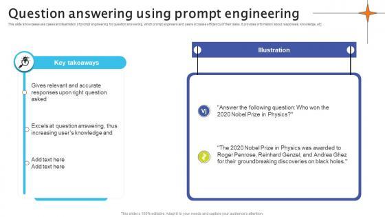 This slide showcases use cases and illustration of prompt engineering for question answering, which prompt engineers and users increase efficiency of their tasks. It provides information about responses, knowledge, etc. Are you searching for a Question Answering Using Prompt Engineering Crafting Interactions A Guide AI SS V that is uncluttered, straightforward, and original Its easy to edit, and you can change the colors to suit your personal or business branding. For a presentation that expresses how much effort you have put in, this template is ideal With all of its features, including tables, diagrams, statistics, and lists, its perfect for a business plan presentation. Make your ideas more appealing with these professional slides. Download Question Answering Using Prompt Engineering Crafting Interactions A Guide AI SS V from Slidegeeks today. This slide showcases use cases and illustration of prompt engineering for question answering, which prompt engineers and users increase efficiency of their tasks. It provides information about responses, knowledge, etc.