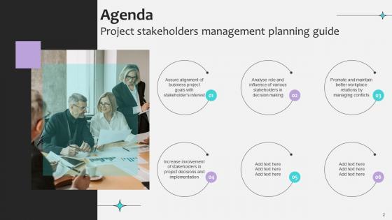 Find a pre-designed and impeccable Agenda Project Stakeholders Management Planning Guide Ppt Example. The templates can ace your presentation without additional effort. You can download these easy-to-edit presentation templates to make your presentation stand out from others. So, what are you waiting for Download the template from Slidegeeks today and give a unique touch to your presentation. Our Agenda Project Stakeholders Management Planning Guide Ppt Example are topically designed to provide an attractive backdrop to any subject. Use them to look like a presentation pro.