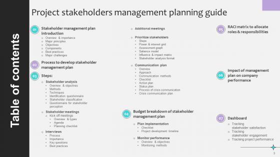 This Table Of Contents Project Stakeholders Management Planning Guide Ppt Example from Slidegeeks makes it easy to present information on your topic with precision. It provides customization options, so you can make changes to the colors, design, graphics, or any other component to create a unique layout. It is also available for immediate download, so you can begin using it right away. Slidegeeks has done good research to ensure that you have everything you need to make your presentation stand out. Make a name out there for a brilliant performance. Our Table Of Contents Project Stakeholders Management Planning Guide Ppt Example are topically designed to provide an attractive backdrop to any subject. Use them to look like a presentation pro.