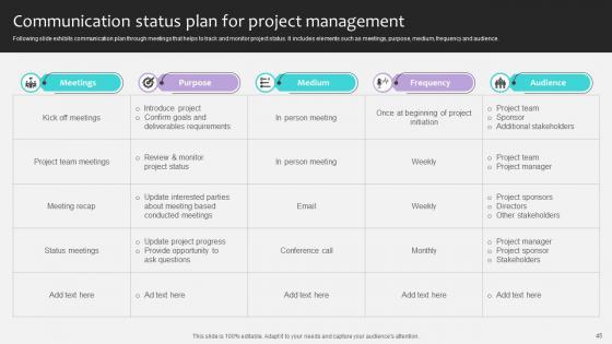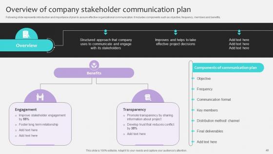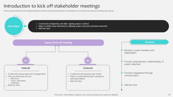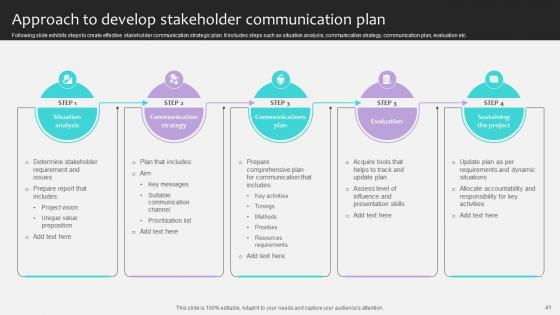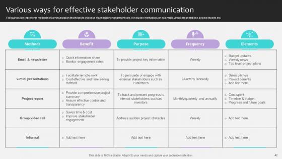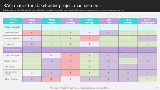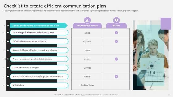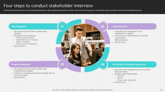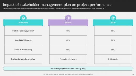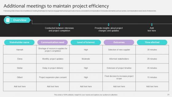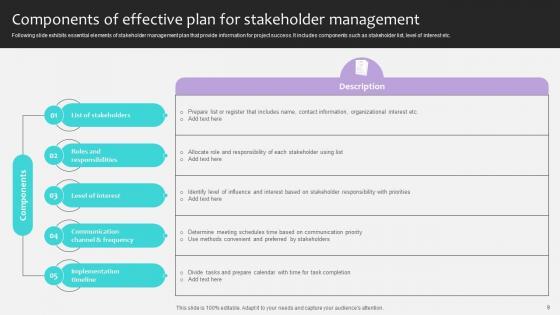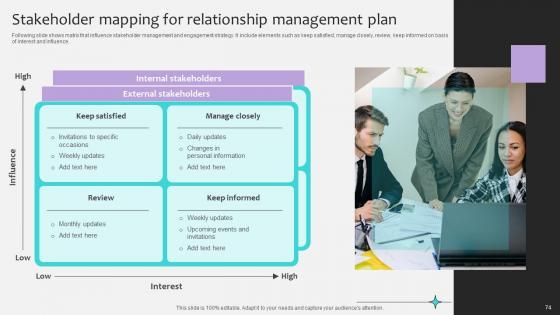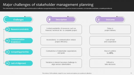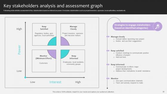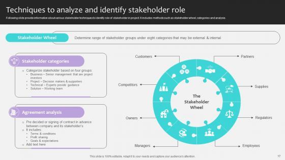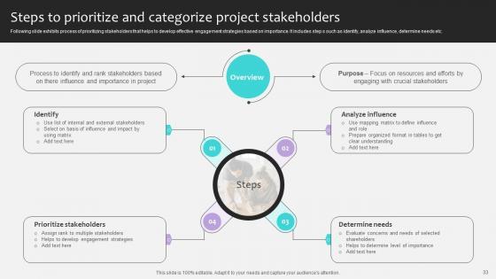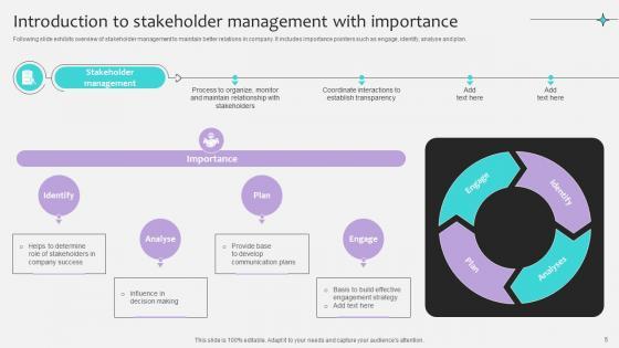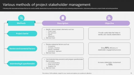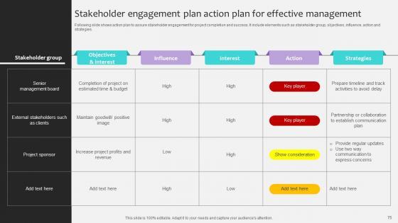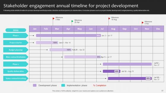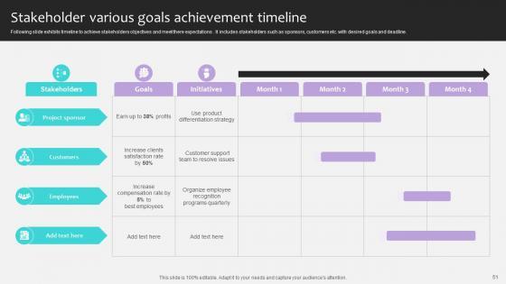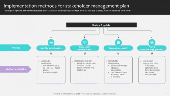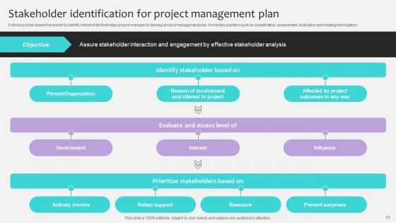 Using this ready-made PowerPoint slide, you can incorporate your own data to make an impact with your business innovation and clarity of goals. Use this brilliantly designed Guide To Creating A Project Stakeholder Engagement Plan Ppt PowerPoint Presentation Complete Deck With Slides to showcase how ultimately all business concepts are related. This presentation template can also be used to record resource allocation in a visual form. The seventy seven Slide Guide To Creating A Project Stakeholder Engagement Plan Ppt PowerPoint Presentation Complete Deck With Slides is suitable for all your business needs, where you need to make sure that all bases are covered. Download this PPT template now to start a journey on your chosen business, with customer satisfaction the key aim.