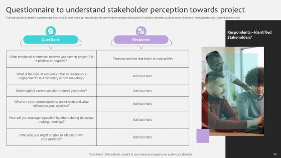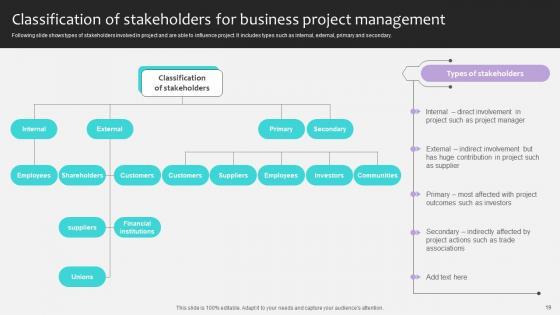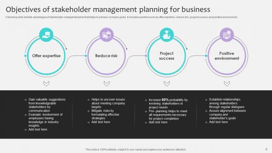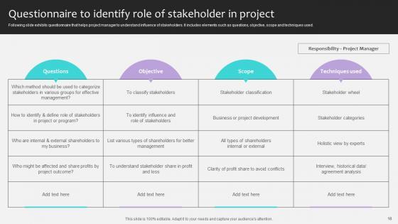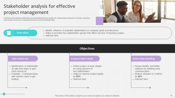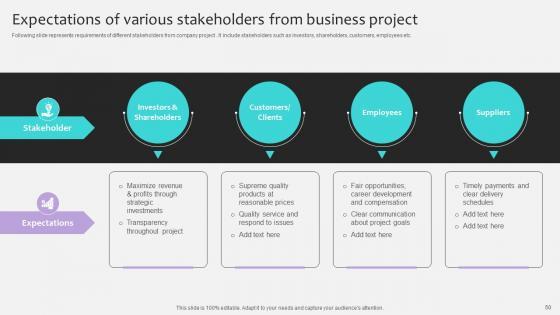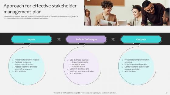 You will save yourself your energy and hours of time when you choose to use this impactful PowerPoint Deck. This Project Stakeholders Management Planning Guide Complete Deck Ppt Example has been tailor-made to your business needs which ensures that you will always be prepared for that next meeting. Worry can not touch you when you present in your area of expertise using this PPT Template Bundle. With a modern design and easy to follow structure, this PowerPoint Presentation has seventy eight-slides, which ensures that you can cover you need to without much work. Create your next presentation using this PPT Theme to deliver a memorable performance. Our Project Stakeholders Management Planning Guide Complete Deck Ppt Example are topically designed to provide an attractive backdrop to any subject. Use them to look like a presentation pro.