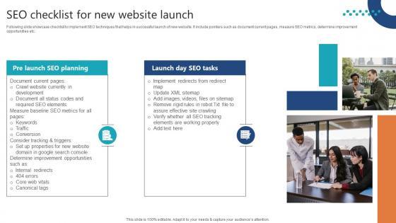 Following slide showcase checklist to implement SEO techniques that helps in successful launch of new website. It include pointers such as document current pages, measure SEO metrics, determine improvement opportunities etc. From laying roadmaps to briefing everything in detail, our templates are perfect for you. You can set the stage with your presentation slides. All you have to do is download these easy-to-edit and customizable templates. Complete Guide To Launch SEO Checklist For New Website Launch will help you deliver an outstanding performance that everyone would remember and praise you for. Do download this presentation today. Following slide showcase checklist to implement SEO techniques that helps in successful launch of new website. It include pointers such as document current pages, measure SEO metrics, determine improvement opportunities etc.