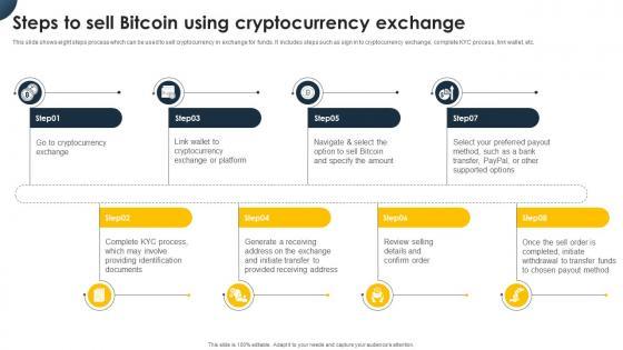 This slide shows eight steps process which can be used to sell cryptocurrency in exchange for funds. It includes steps such as sign in to cryptocurrency exchange, complete KYC process, link wallet, etc. Want to ace your presentation in front of a live audience Our Complete Beginners Guide Steps To Sell Bitcoin Using Cryptocurrency Exchange Fin SS V can help you do that by engaging all the users towards you. Slidegeeks experts have put their efforts and expertise into creating these impeccable powerpoint presentations so that you can communicate your ideas clearly. Moreover, all the templates are customizable, and easy-to-edit and downloadable. Use these for both personal and commercial use. This slide shows eight steps process which can be used to sell cryptocurrency in exchange for funds. It includes steps such as sign in to cryptocurrency exchange, complete KYC process, link wallet, etc.