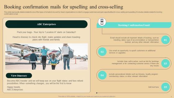 This slide represents details related to one of the types of emails to be sent by travel organizations in order to engage customers and gain opportunities for cross-selling and upselling. It includes details related to booking confirmation email. From laying roadmaps to briefing everything in detail, our templates are perfect for you. You can set the stage with your presentation slides. All you have to do is download these easy-to-edit and customizable templates. Guide To Winning Tourism Booking Confirmation Mails For Upselling And Cross Selling Mockup Pdf will help you deliver an outstanding performance that everyone would remember and praise you for. Do download this presentation today. This slide represents details related to one of the types of emails to be sent by travel organizations in order to engage customers and gain opportunities for cross-selling and upselling. It includes details related to booking confirmation email.