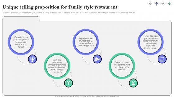 This slide represents USP Unique Selling Proposition for family style restaurant. It highlights details such as authentic food flavors, welcoming atmosphere, farm-to-table approach, etc. Find highly impressive Unique Selling Proposition For Family Style Restaurant Strategic Guide To Launching Ppt Slides on Slidegeeks to deliver a meaningful presentation. You can save an ample amount of time using these presentation templates. No need to worry to prepare everything from scratch because Slidegeeks experts have already done a huge research and work for you. You need to download Unique Selling Proposition For Family Style Restaurant Strategic Guide To Launching Ppt Slides for your upcoming presentation. All the presentation templates are 100 percent editable and you can change the color and personalize the content accordingly. Download now This slide represents USP Unique Selling Proposition for family style restaurant. It highlights details such as authentic food flavors, welcoming atmosphere, farm-to-table approach, etc.
