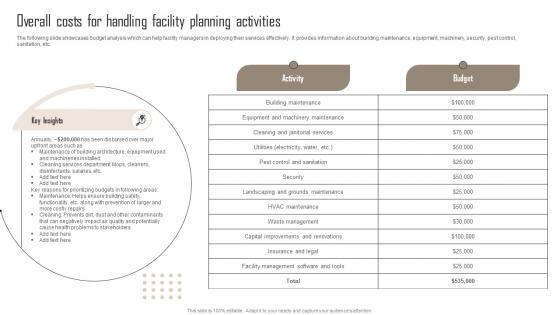 The following slide showcases budget analysis which can help facility managers in deploying their services effectively. It provides information about building maintenance, equipment, machinery, security, pest control, sanitation, etc. Are you searching for a Overall Costs For Handling Comprehensive Guide For Building Management Template Pdf that is uncluttered, straightforward, and original It is easy to edit, and you can change the colors to suit your personal or business branding. For a presentation that expresses how much effort you have put in, this template is ideal With all of its features, including tables, diagrams, statistics, and lists, it is perfect for a business plan presentation. Make your ideas more appealing with these professional slides. Download Overall Costs For Handling Comprehensive Guide For Building Management Template Pdf from Slidegeeks today. The following slide showcases budget analysis which can help facility managers in deploying their services effectively. It provides information about building maintenance, equipment, machinery, security, pest control, sanitation, etc.