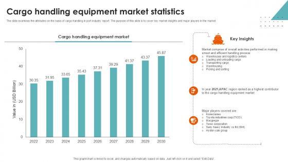 The slide examines the attributes on the basis of cargo handling in port industry report. The purpose of this slide is to cover key market insights and major players in the market.Create an editable Cargo Handling Equipment Market Statistics Port Terminal Industry Ppt Presentation that communicates your idea and engages your audience. Whether you are presenting a business or an educational presentation, pre designed presentation templates help save time. Cargo Handling Equipment Market Statistics Port Terminal Industry Ppt Presentation is highly customizable and very easy to edit, covering many different styles from creative to business presentations. Slidegeeks has creative team members who have crafted amazing templates. So, go and get them without any delay. The slide examines the attributes on the basis of cargo handling in port industry report. The purpose of this slide is to cover key market insights and major players in the market.