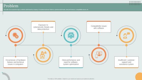 This slide showcases the major problems addressed by company. It includes hardware failures, cybersecurity threats, slow performance, compatibility issues, etc. Whether you have daily or monthly meetings, a brilliant presentation is necessary. Problem Hardware Technology Provider Business Model BMC SS V can be your best option for delivering a presentation. Represent everything in detail using Problem Hardware Technology Provider Business Model BMC SS V and make yourself stand out in meetings. The template is versatile and follows a structure that will cater to your requirements. All the templates prepared by Slidegeeks are easy to download and edit. Our research experts have taken care of the corporate themes as well. So, give it a try and see the results. This slide showcases the major problems addressed by company. It includes hardware failures, cybersecurity threats, slow performance, compatibility issues, etc.