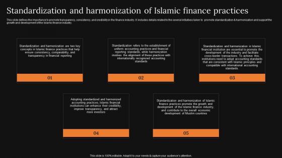 This slide defines the importance to promote transparency, consistency, and credibility in the finance industry. It includes details related to the several initiatives taken to promote standardization and harmonization and support the growth and development of the Islamic finance industry. Create an editable Standardization And Harmonization Of Islamic Comprehensive Guide Islamic Infographics PDF that communicates your idea and engages your audience. Whether you are presenting a business or an educational presentation, pre-designed presentation templates help save time. Standardization And Harmonization Of Islamic Comprehensive Guide Islamic Infographics PDF is highly customizable and very easy to edit, covering many different styles from creative to business presentations. Slidegeeks has creative team members who have crafted amazing templates. So, go and get them without any delay. This slide defines the importance to promote transparency, consistency, and credibility in the finance industry. It includes details related to the several initiatives taken to promote standardization and harmonization and support the growth and development of the Islamic finance industry.