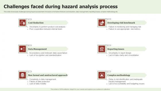 This slide showcases challenges during hazard assessment. It include some factors that are cost reduction, data management, reporting issues, complex methodology etc. Showcasing this set of slides titled Challenges Faced During Hazard Analysis Process Structure Pdf. The topics addressed in these templates are Cost Reduction, Data Management, Reporting Issues. All the content presented in this PPT design is completely editable. Download it and make adjustments in color, background, font etc. as per your unique business setting. This slide showcases challenges during hazard assessment. It include some factors that are cost reduction, data management, reporting issues, complex methodology etc.