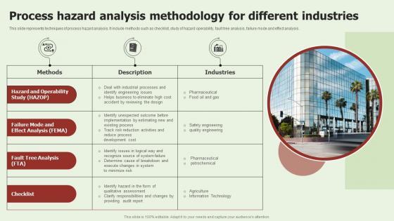 This slide represents techniques of process hazard analysis. It include methods such as checklist, study of hazard operability, fault tree analysis, failure mode and effect analysis. Showcasing this set of slides titled Process Hazard Analysis Methodology For Different Industries Summary Pdf. The topics addressed in these templates are Hazard And Operability, Failure Mode. All the content presented in this PPT design is completely editable. Download it and make adjustments in color, background, font etc. as per your unique business setting. This slide represents techniques of process hazard analysis. It include methods such as checklist, study of hazard operability, fault tree analysis, failure mode and effect analysis.