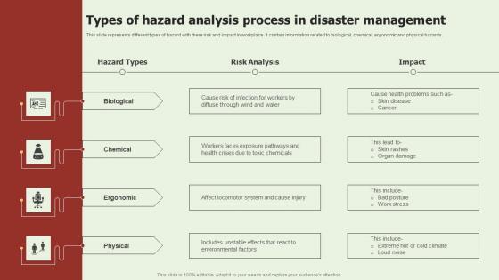 This slide represents different types of hazard with there risk and impact in workplace. It contain information related to biological, chemical, ergonomic and physical hazards. Showcasing this set of slides titled Types Of Hazard Analysis Process In Disaster Management Formats Pdf. The topics addressed in these templates are Biological, Chemical, Ergonomic. All the content presented in this PPT design is completely editable. Download it and make adjustments in color, background, font etc. as per your unique business setting. This slide represents different types of hazard with there risk and impact in workplace. It contain information related to biological, chemical, ergonomic and physical hazards.