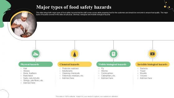 This slide brings forth major types of food safety hazards that the staff comes across while preparing food for the customers and should be overcome to ensure food quality. The major types of hazards covered in this slide are physical, chemical, biological and invisible biological hazards. Presenting this PowerPoint presentation, titled Major Types Of Food Safety Hazards Quality Control Guide For Food PPT Example, with topics curated by our researchers after extensive research. This editable presentation is available for immediate download and provides attractive features when used. Download now and captivate your audience. Presenting this Major Types Of Food Safety Hazards Quality Control Guide For Food PPT Example. Our researchers have carefully researched and created these slides with all aspects taken into consideration. This is a completely customizable Major Types Of Food Safety Hazards Quality Control Guide For Food PPT Example that is available for immediate downloading. Download now and make an impact on your audience. Highlight the attractive features available with our PPTs. This slide brings forth major types of food safety hazards that the staff comes across while preparing food for the customers and should be overcome to ensure food quality. The major types of hazards covered in this slide are physical, chemical, biological and invisible biological hazards