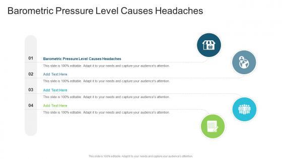 Introducing our well designed Barometric Pressure Causes Headaches In Powerpoint And Google Slides Cpb. This PowerPoint design presents information on topics like Barometric Pressure Causes Headaches. As it is predesigned it helps boost your confidence level. It also makes you a better presenter because of its high quality content and graphics. This PPT layout can be downloaded and used in different formats like PDF, PNG, and JPG. Not only this, it is available in both Standard Screen and Widescreen aspect ratios for your convenience. Therefore, click on the download button now to persuade and impress your audience. Our Barometric Pressure Causes Headaches In Powerpoint And Google Slides Cpb are topically designed to provide an attractive backdrop to any subject. Use them to look like a presentation pro.