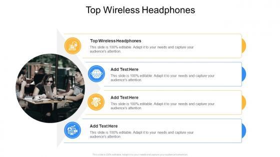 Introducing our well designed Top Wireless Headphones In Powerpoint And Google Slides Cpb This PowerPoint design presents information on topics like Top Wireless Headphones As it is predesigned it helps boost your confidence level. It also makes you a better presenter because of its high quality content and graphics. This PPT layout can be downloaded and used in different formats like PDF, PNG, and JPG. Not only this, it is available in both Standard Screen and Widescreen aspect ratios for your convenience. Therefore, click on the download button now to persuade and impress your audience. Our Top Wireless Headphones In Powerpoint And Google Slides Cpb are topically designed to provide an attractive backdrop to any subject. Use them to look like a presentation pro.