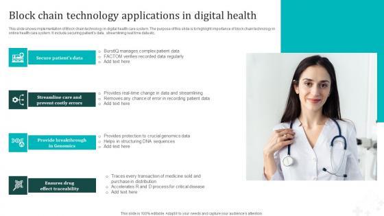 This slide shows implementation of Block chain technology in digital health care system. The purpose of this slide is to highlight importance of block chain technology in online health care system. It include securing patients data, streamlining real time data etc.Showcasing this set of slides titled Block Chain Technology Applications In Digital Health Brochure Pdf The topics addressed in these templates are Prevent Costly Errors, Ensures Drug, Effect Traceability All the content presented in this PPT design is completely editable. Download it and make adjustments in color, background, font etc. as per your unique business setting. This slide shows implementation of Block chain technology in digital health care system. The purpose of this slide is to highlight importance of block chain technology in online health care system. It include securing patients data, streamlining real time data etc.