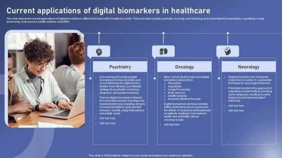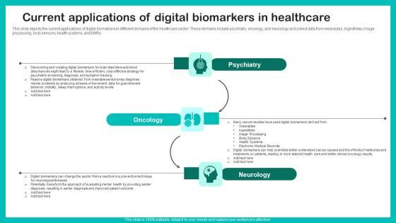 This slide depicts the current applications of digital biomarkers in different domains of the healthcare sector. These domains include psychiatry, oncology, and neurology and collect data from wearables, ingestibles, image processing, body sensors, health systems, and EMRs. Slidegeeks is one of the best resources for PowerPoint templates. You can download easily and regulate Current Applications Of Digital Biomarkers For Personalized Health Insights Summary Pdf for your personal presentations from our wonderful collection. A few clicks is all it takes to discover and get the most relevant and appropriate templates. Use our Templates to add a unique zing and appeal to your presentation and meetings. All the slides are easy to edit and you can use them even for advertisement purposes. This slide depicts the current applications of digital biomarkers in different domains of the healthcare sector. These domains include psychiatry, oncology, and neurology and collect data from wearables, ingestibles, image processing, body sensors, health systems, and EMRs.